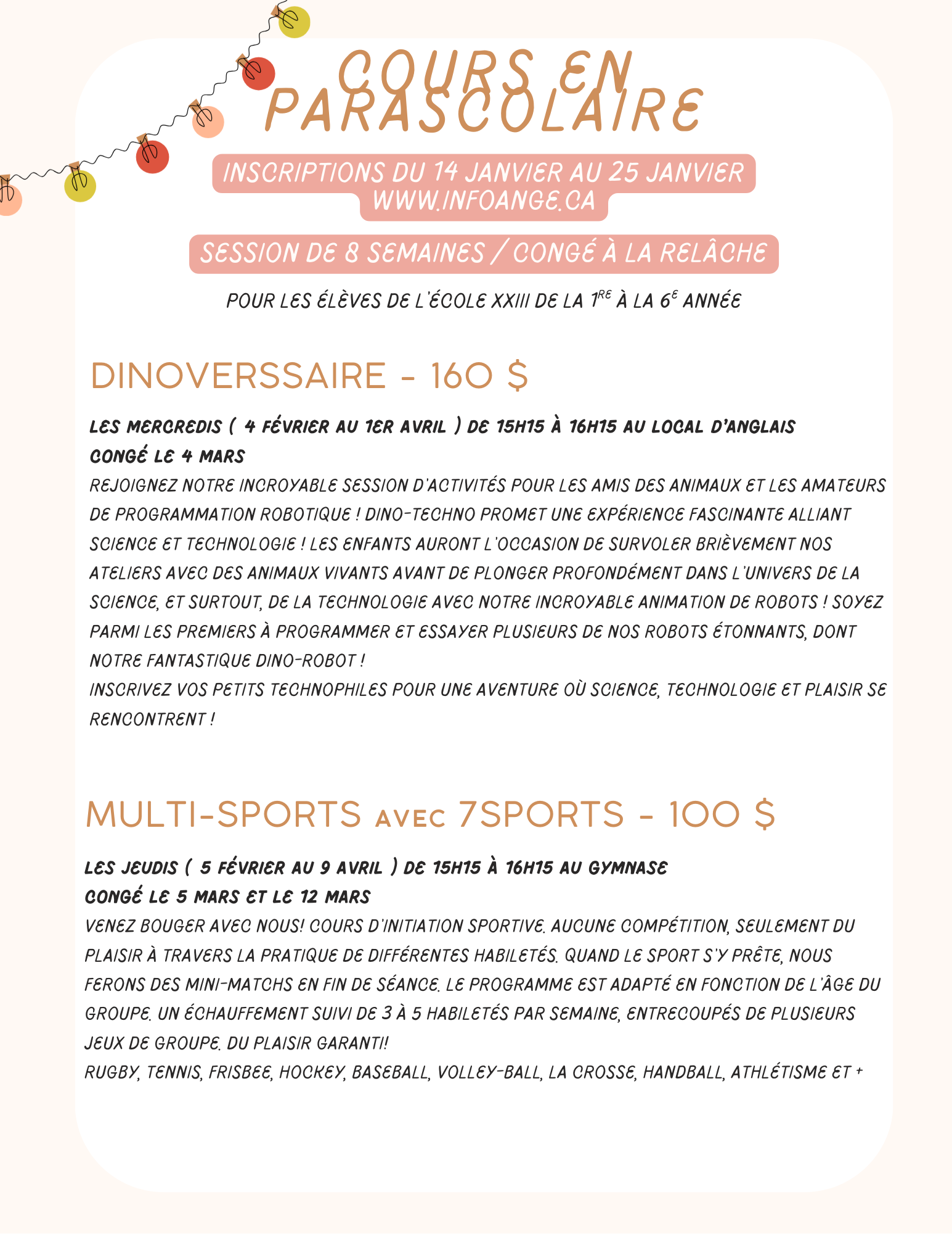 Inscriptions 7Sports - Complet. Si vous êtes intéressés par cette activité, contactez Jennie Rainville au j.rainville@municipalite.ange-gardien.qc.ca