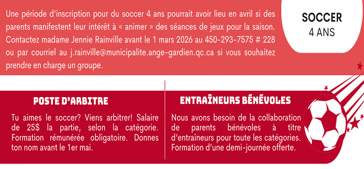 Si vous avez manqué la période d'inscriptions, veuillez contacter Mme Jennie Rainville au j.rainville@municipalite.ange-gardien.qc.ca